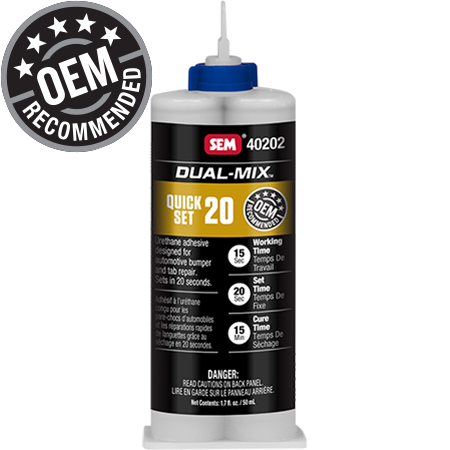 Dual-Mix™ Quick Set 20 is a very fast, two-component, opaque, urethane adhesive designed for bumper tab repair and bonding most small plastic, steel and aluminum parts.